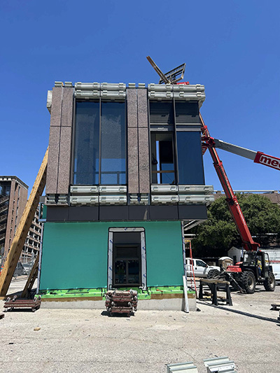 The construction crew used a 10,000-pound forklift to hoist the curtain wall panels then maneuvered them into place using a mobile elevating boom lift. The project team strategically oriented the mock-up wall to simulate the daylight conditions of the 1501 Lavaca State Office Building. Jobsite ladders, built by the project’s carpenters, allow access to Level 2 and the roof.